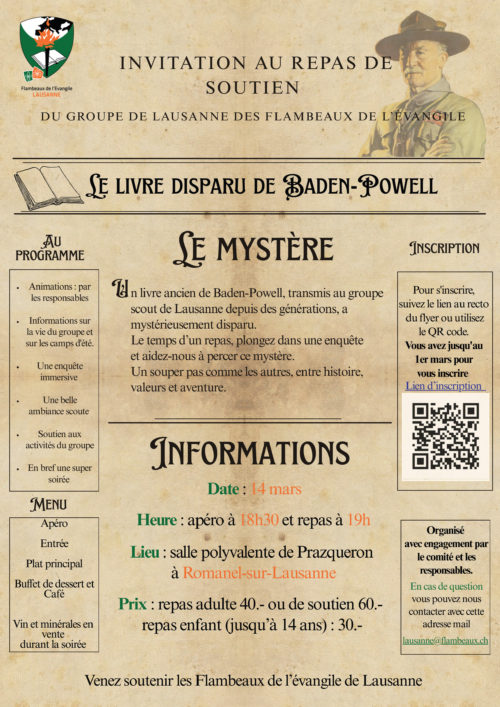 INVITATION AU REPAS DE SOUTIEN du Groupe de Lausanne des Flambeaux de l’Évangile Date lundi, 12 janvier 2026 Auteur Alain Catégorie Autres oeuvres, Flambeaux de l'Evangile Télécharger le Invitation_souper de soutien 2026