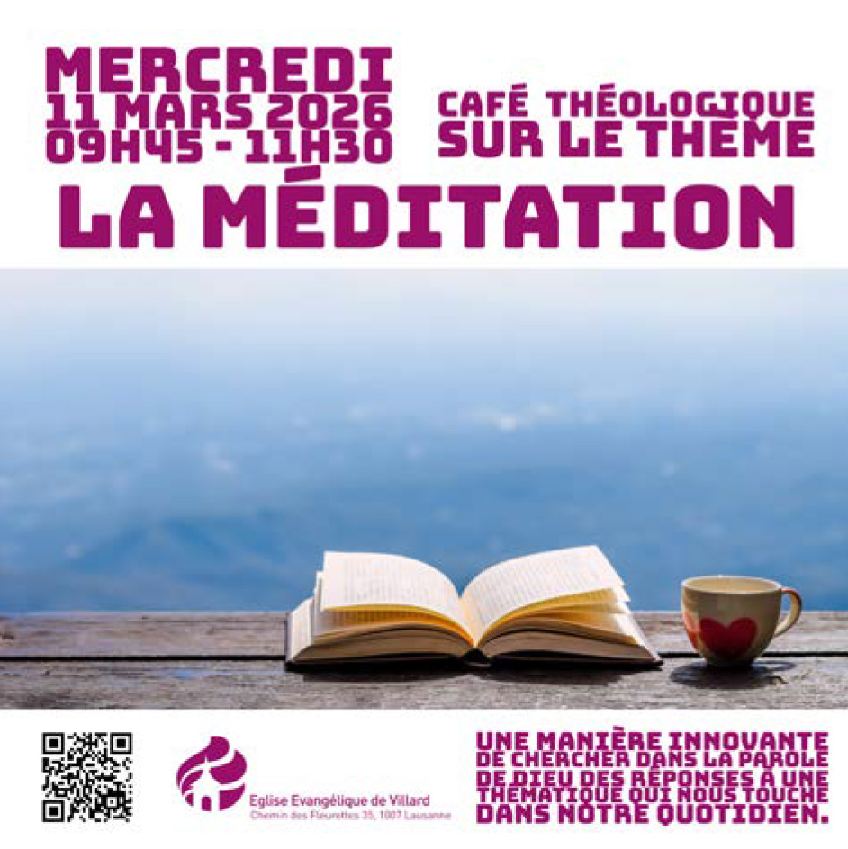 Ch. des Fleurettes 35 1007 Lausanne Eglise Evangélique de Villard Itinéraire CAFÉ THÉOLOGIQUE sur le thème : LA MÉDITATION Date mercredi, 11 mars 2026 Heure 9 h 45 min – 11 h 30 min