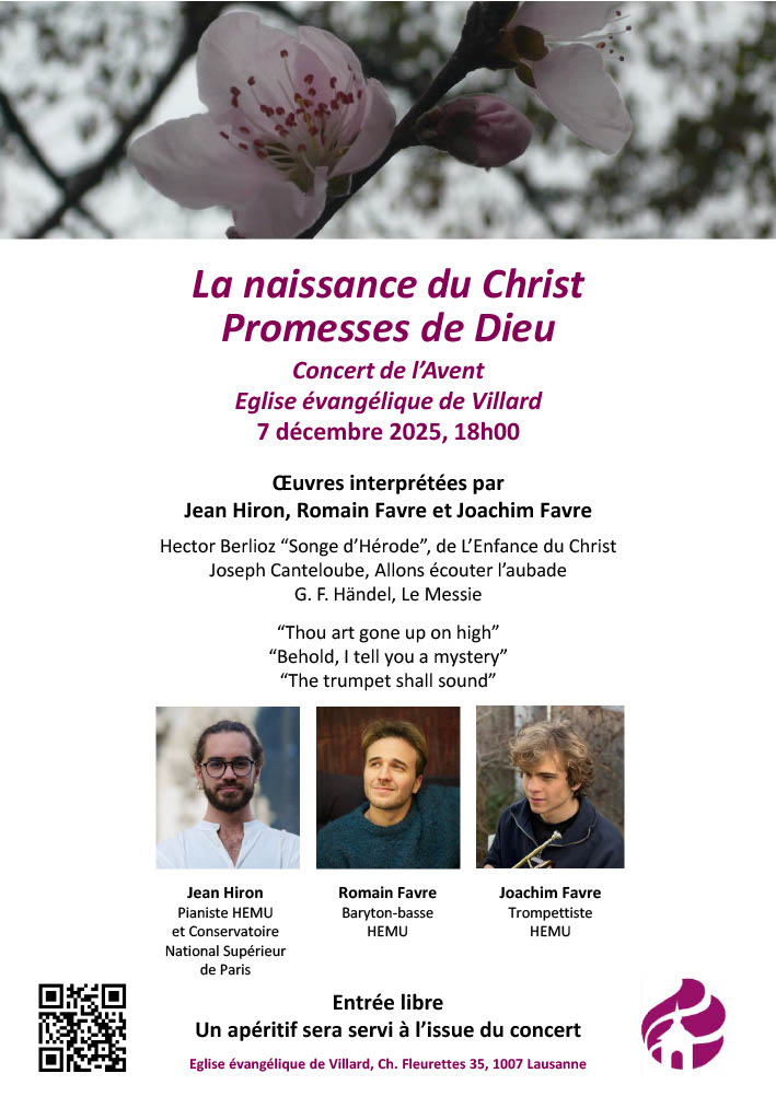 Ch. des Fleurettes 35 1007 Lausanne Eglise Evangélique de Villard Itinéraire La naissance du Christ – Promesses de Dieu – Concert de l’Avent Date dimanche, 7 décembre 2025 Heure 18 h 00 min – 19 h 30 min Catégorie Concert Téléchargement : Flyer_EEV_Concert_Avent 2025_EEV